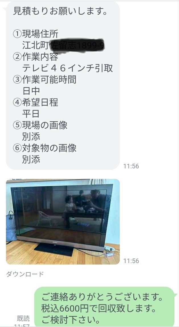 LINEにて画像と内容を確認したところ、テレビの回収費用は税込6,600円でお見積もりさせていただきました。
